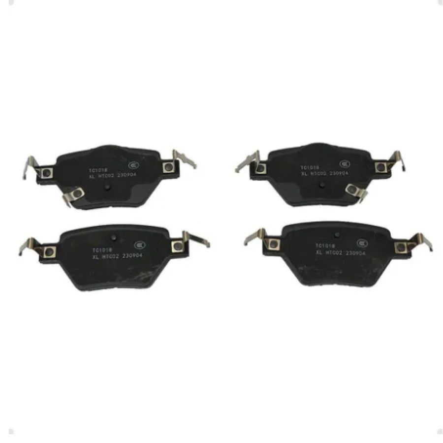 During braking, the pads press against the rear brake discs (rotors) to convert vehicle kinetic energy into heat and safely slow the vehicle.