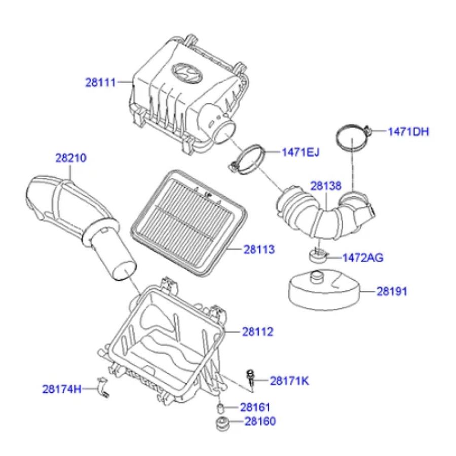 The Genuine Hyundai Air Cleaner Body (Part Number 28112‑0X000) is the lower housing of the engine air intake system used in the first‑generation Hyundai i10. This component holds the air filter element and forms the base of the air cleaner assembly, ensuring proper airflow to the engine while preventing dust and contaminants from entering the intake system.